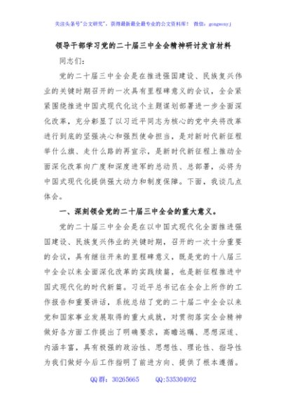 / 领导干部学习党的二十届三中全会精神研讨发言材料