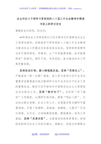 / 在全市社工干部学习贯彻党的二十届三中全会精神专题读书班上的研讨发言