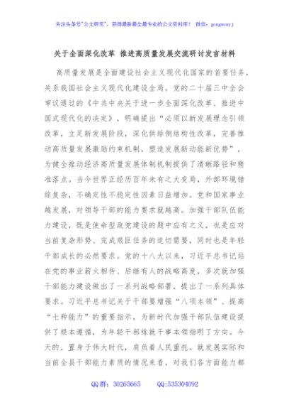 / 关于全面深化改革 推进高质量发展交流研讨发言材料