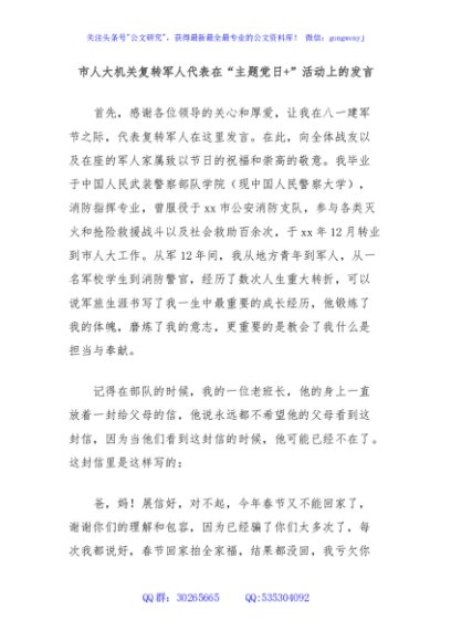 / 市人大机关复转军人代表在“主题党日+”活动上的发言