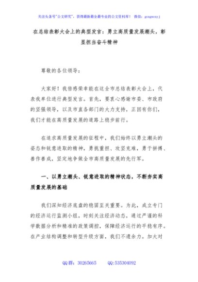 / 在总结表彰大会上的典型发言:勇立高质量发展潮头,彰显担当奋斗精神