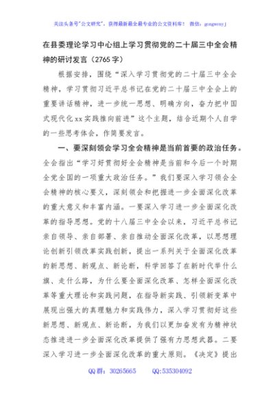/ 在县委理论学习中心组上学习贯彻党的二十届三中全会精神的研讨发言(2765字)