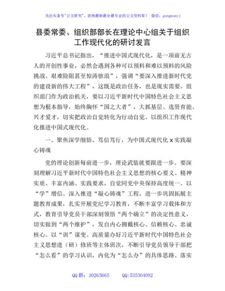 / 组织部部长在理论中心组关于组织工作现代化的研讨发言