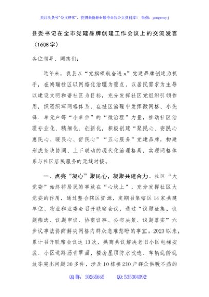 / 县委书记在全市党建品牌创建工作会议上的交流发言(1608字)
