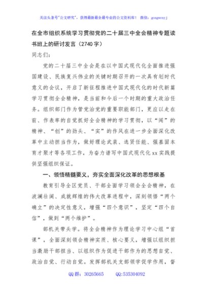 / 在全市组织系统学习贯彻党的二十届三中全会精神专题读书班上的研讨发言(2740字)
