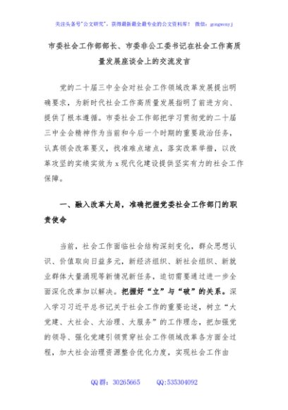 / 市委社会工作部部长、市委非公工委书记在社会工作高质量发展座谈会上的交流发言