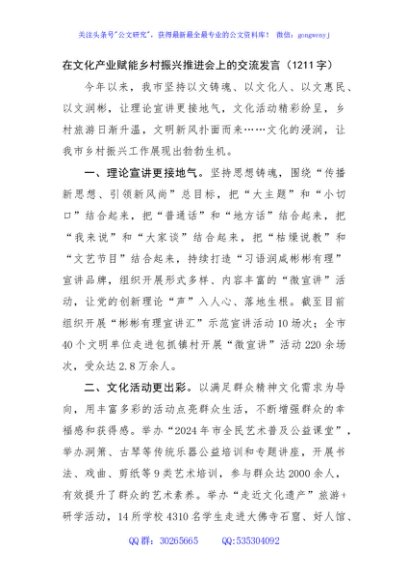 / 在文化产业赋能乡村振兴推进会上的交流发言(1211字)