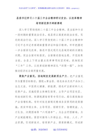 / 县委书记学习二十届三中全会精神研讨发言:以改革精神培育新优势开辟新赛道