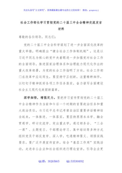 / 社会工作部长学习贯彻党的二十届三中全会精神交流发言材料