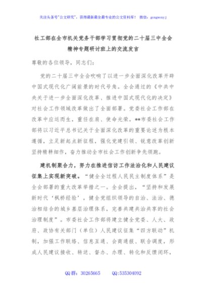 / 社工部在全市机关党务干部学习贯彻党的二十届三中全会精神专题研讨班上的交流发言