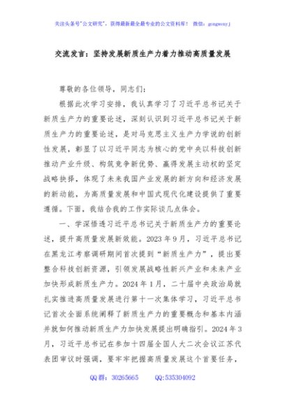 交流发言:坚持发展新质生产力着力推动高质量发展