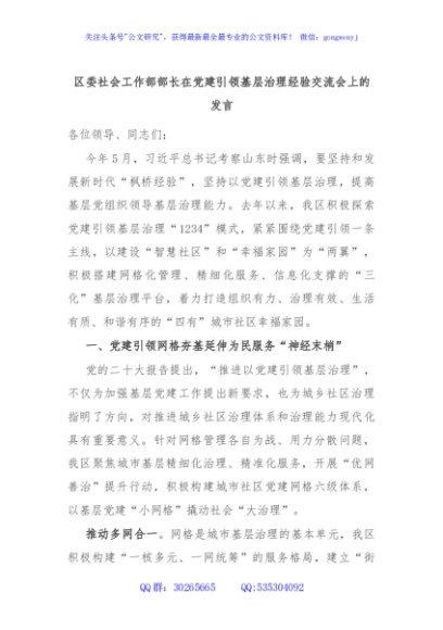 / 区委社会工作部部长在党建引领基层治理经验交流会上的发言