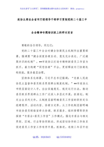 / 政协主席在全省市厅级领导干部学习贯彻党的二十届三中全会精神专题培训班上的研讨发言