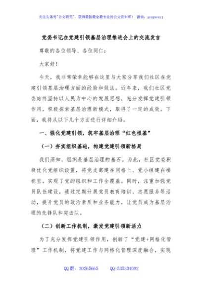 / 党委书记在党建引领基层治理推进会上的交流发言