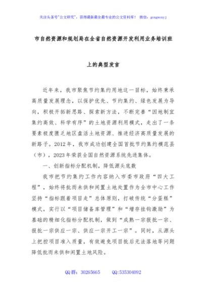 / 市自然资源和规划局在全省自然资源开发利用业务培训班上的典型发言