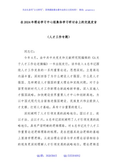 / 在2024年理论学习中心组集体学习研讨会上的交流发言(人才工作专题)