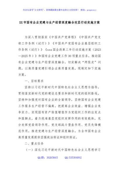 / XX市国有企业党建与生产经营深度融合攻坚行动实施方案