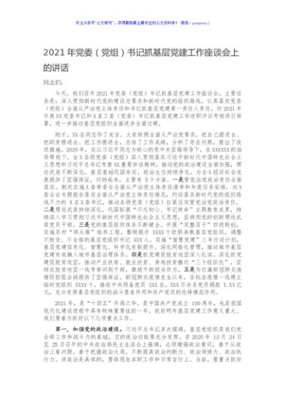 2021年党委(党组)书记抓基层党建工作座谈会上的讲话