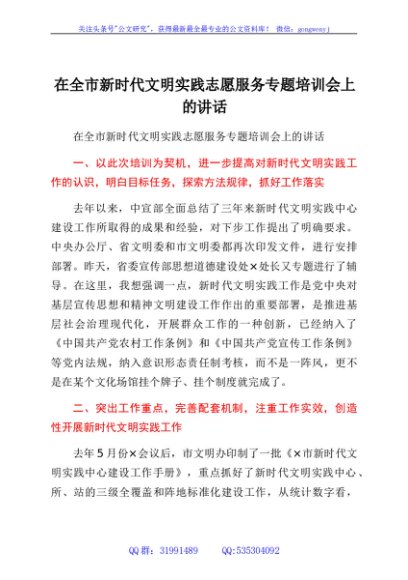 / 在全市新时代文明实践志愿服务专题培训会上的讲话