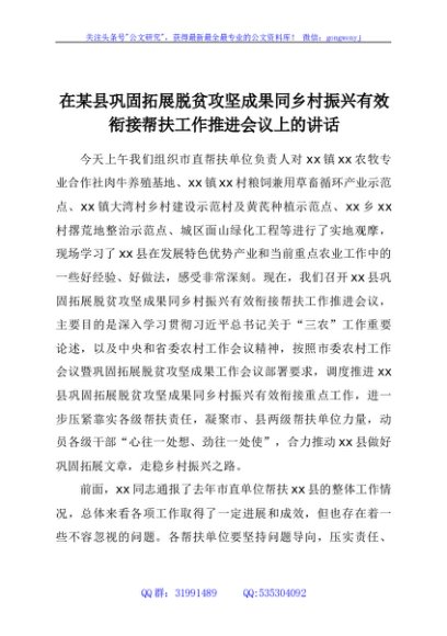 / 在某县巩固拓展脱贫攻坚成果同乡村振兴有效衔接帮扶工作推进会议上的讲话