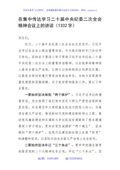 / 在集中传达学习二十届中央纪委二次全会精神会议上的讲话