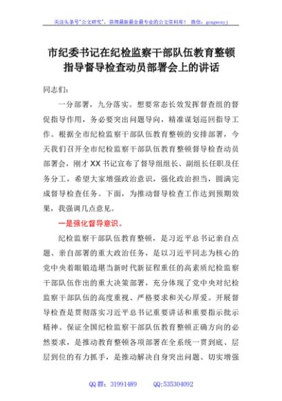 / 市纪委书记在纪检监察干部队伍教育整顿指导督导检查动员部署会上的讲话