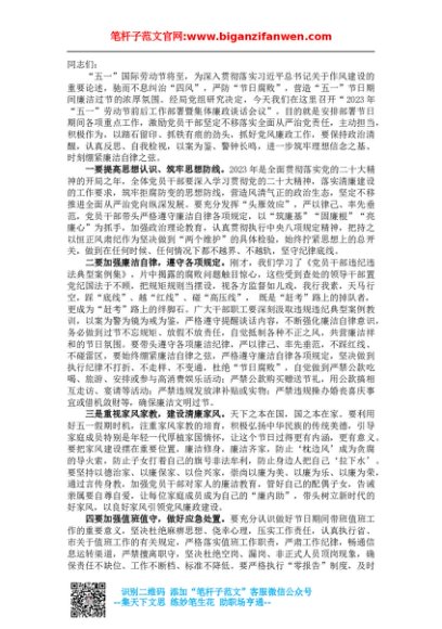 / 在2023年“五一”劳动节前工作安排部署暨集体廉政谈话会议上的讲话