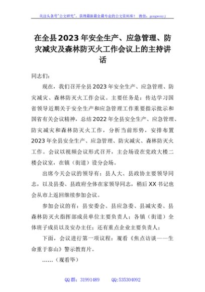 / 在全县2023年安全生产、应急管理、防灾减灾及森林防灭火工作会议上的主持讲话