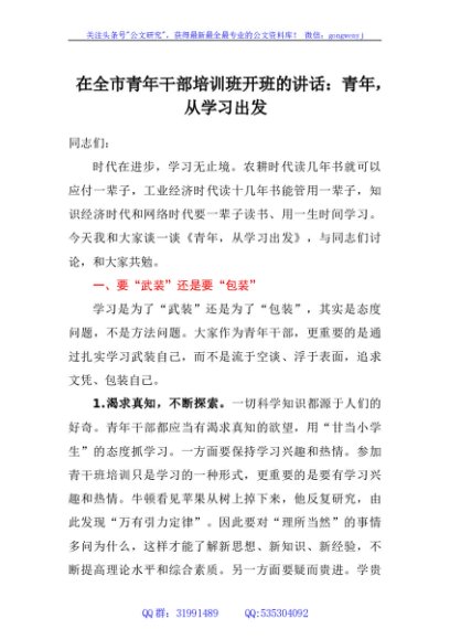 / 在全市青年干部培训班开班的讲话:青年,从学习出发