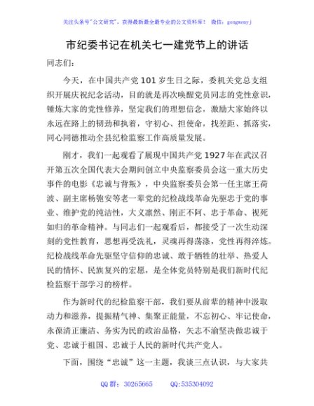 / 七一建党节上的讲话(市纪委书记在机关)3100字
