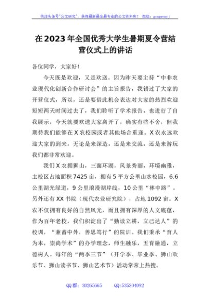 / 在2023年全国优秀大学生暑期夏令营结营仪式上的讲话