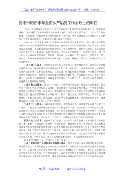 / 党组书记在半年全面从严治党工作会议上的讲话
