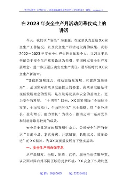 / 在2023年安全生产月活动闭幕仪式上的讲话