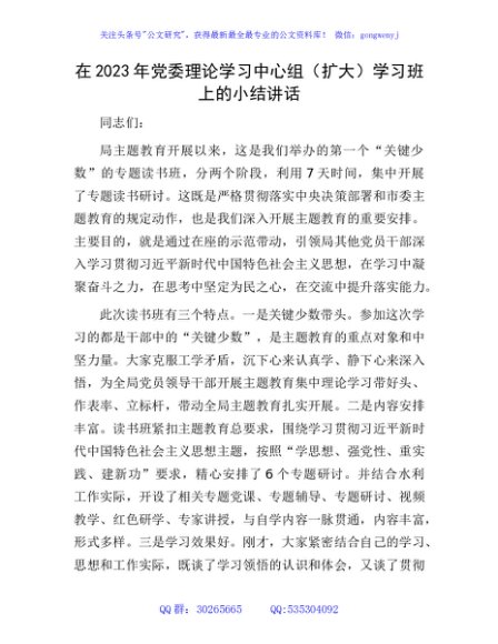 / 在2023年中心组主题教育学习班上的小结讲话