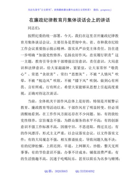 / 在廉政纪律教育月集体谈话会上的讲话