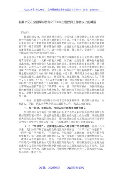 / 县委书记在全县学习贯彻2023年主题教育工作会议上的讲话