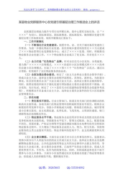 / 某县物业党群服务中心在党建引领基层治理工作推进会上的讲话