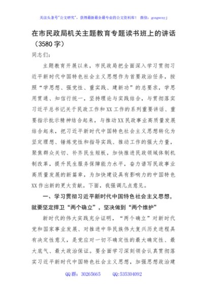 / 在市民政局机关主题教育专题读书班上的讲话
