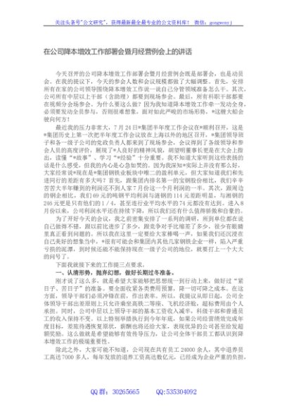 / 在公司降本增效工作部署会暨月经营例会上的讲话