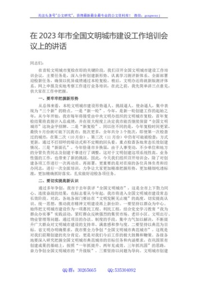 / 在2023年市全国文明城市建设工作培训会议上的讲话