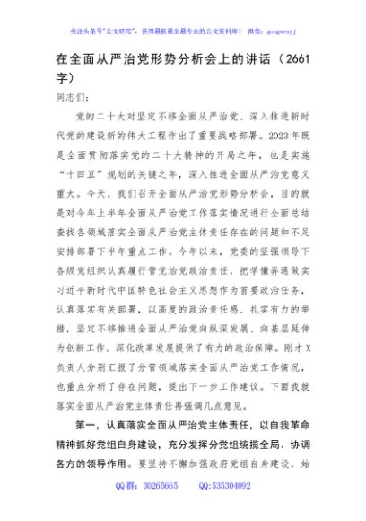 / 在全面从严治党形势分析会上的讲话