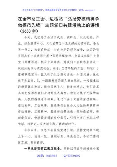 / 在全市总工会、边检站“弘扬劳模精神争做模范先锋”主题党日共建活动上的讲话