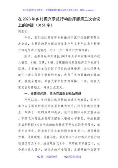 / 在2023年乡村振兴示范行动指挥部第三次会议上的讲话