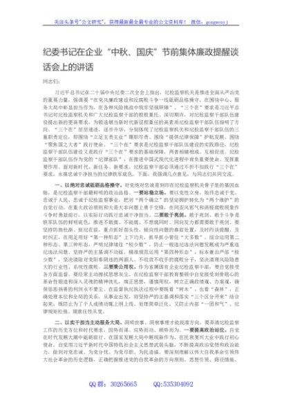 / 纪委书记在企业中秋、国庆节前集体廉政提醒谈话会上的讲话