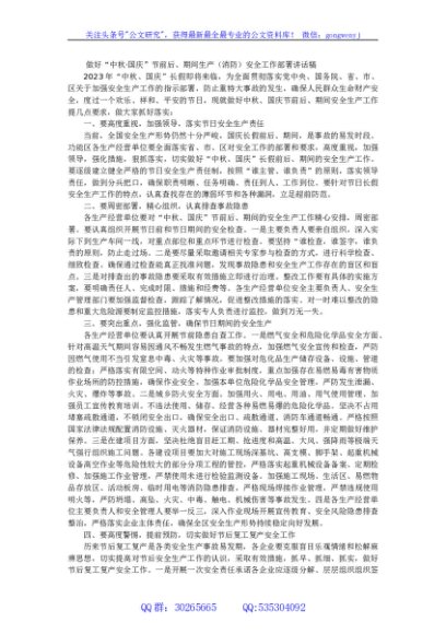 / 做好中秋·国庆节前后、期间生产(消防)安全工作部署讲话稿