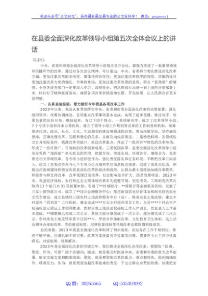 / 在县委全面深化改革领导小组第五次全体会议上的讲话