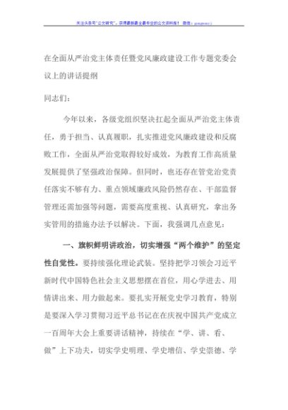 / 在全面从严治党主体责任暨党风廉政建设工作专题党委会议上的讲话提纲