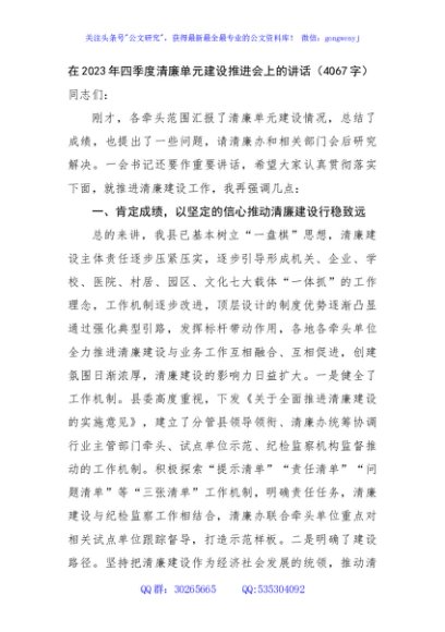 / 在2023年四季度清廉单元建设推进会上的讲话