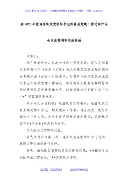 / 在2023年度地直机关党组织书记抓基层党建工作述职评议会议主持词和总结讲话