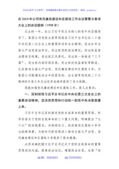 / 国企2024年党风廉政建设和反腐败工作会议暨警示教育大会上的讲话提纲